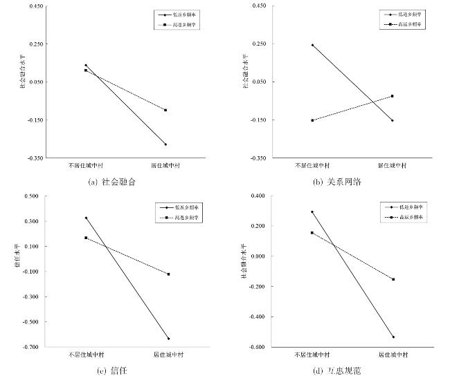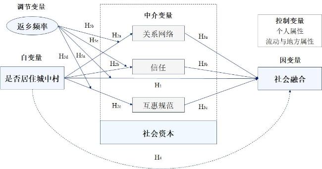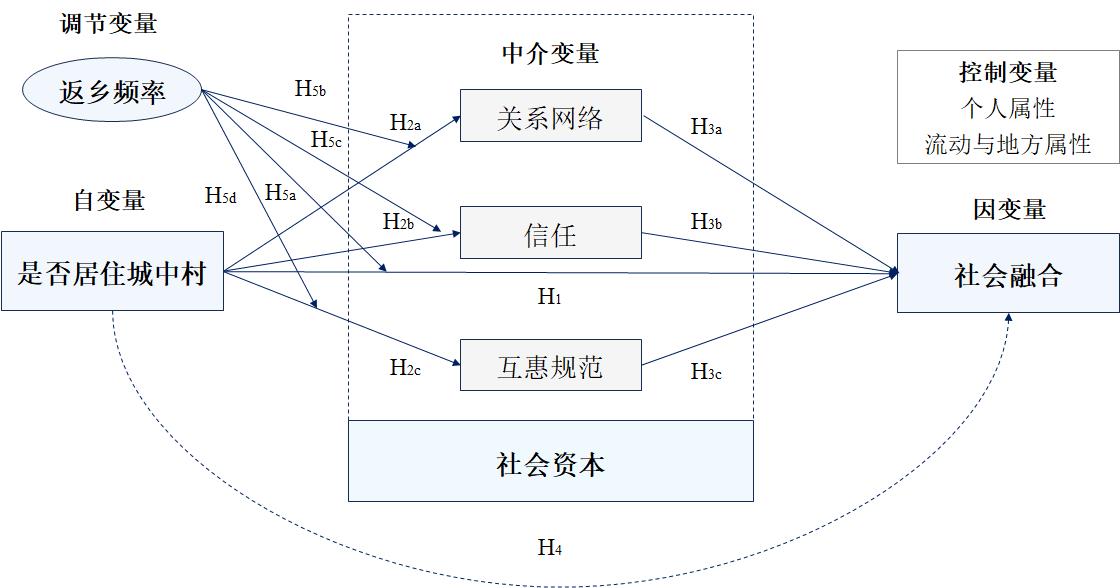 The social integration of the floating population has emerged as a central issue in the context of China's new urbanization. Urban villages, as a primary type of migrant settlement, exert complex influences on migrants' integration experiences. However, the mechanisms through which residential conditions in urban villages affect social integration remain underexplored. Moreover, existing studies predominantly emphasize local integration processes, often overlooking the role of trans-regional interactions. Drawing on original survey data collected in Guangzhou, this study introduces a social capital perspective and develops a theoretical framework linking urban village residence-social capital–social integration. A moderated mediation model is employed to systematically examine: (1) the direct effects of residing in urban villages on social integration; (2) the mediating role of social capital, including relational networks, trust, and reciprocity norms; and (3) the moderating influence of return migration frequency. The findings indicate that: (1) living in urban villages significantly lowers the level of social integration among the floating population, reaffirming the spatial segregation effect; (2) social capital serves as a key mediating mechanism, with relationship networks, trust, and reciprocity acting as distinct transmission pathways; and (3) a higher frequency of returning to one's hometown mitigates the adverse effects of urban village residence on both social capital and social integration, by providing emotional, social, and material support from origin communities. This reveals the moderating function of cross-regional social ties in the integration process. This study advances current understandings of how urban village residential environments influence migrant integration, while extending the application of social capital theory within migration studies. It further highlights the potential of urban villages as spaces for social capital reconstruction and emphasizes the importance of migrants' sustained linkages between their hometowns and host cities. These insights contribute to promoting more inclusive and human-centered urbanization strategies.